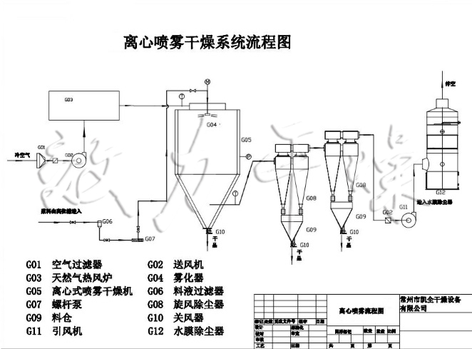 空气通过过滤器和加热器,进入干燥器顶部的空气分配器,热空气呈螺旋状均匀进入干燥器。料液由料液槽经过滤器由泵送至干燥器的离心雾化器,使料液喷成极小的雾状液滴,料液和热空气并流接触,水份迅速蒸发,在极短时间内干燥为粉末状成品。成品由干燥塔底部和旋风分离器排出,废气由风机排出。