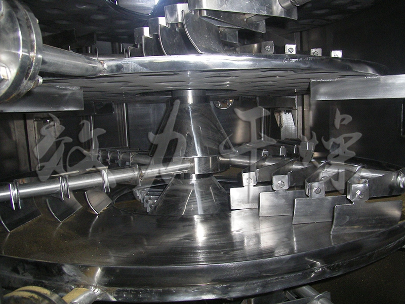湿物料自加料器连续地加到干燥器上部层干燥盘上,带有耙叶的耙臂作回转运动使耙臂作回转运动使耙叶连续地翻抄物料。物料沿指数螺旋线流过干燥盘表面,在小干燥盘上的物料被移送到外缘,并在外缘落到下方的大干燥盘外缘,在大干盘上物料向里移动并从中间落料口落如下一层小干燥盘中。大小干燥盘上下交替排列,物料得以连续地流过整个干燥器。中空的干燥盘内通入加热介质,加热介质形式有饱和蒸汽、热水和导热油,加热介质由干燥盘的一端进入,从另一端导出。已干物料从后一层干燥盘落到壳体的底层,后被耙叶移送到出料口排出。湿份从物料中逸出,由设在顶盖上的排湿口排出,真空型盘式干燥器的湿气由设在顶盖上的真空泵口排出。从底层排出的干物料可直接包装。通过配加翅片加热器、溶剂回收冷凝器、袋式除尘器、干料返混机构、引风机等辅机,可提高其干燥的生产能力,干燥膏糊状和热敏性物 料,可方便地回收溶剂,并能进行热解和反应操作。